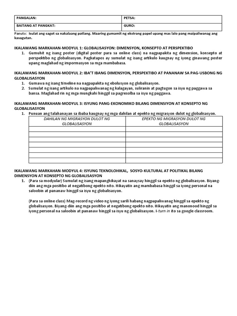 Parallel Assessment Grade 10 from imgv2-1-f.scribdassets.com Paglaki ng agwat sa maunlad at umuunlad na bansa. Edwin planas ada teacher i, dasmariǹas west nhs. Mga suliranin sa mga manggagawa dulot ng globalisasyon. Bumuo ng isang poster slogan tungkol sa naging epekto ng mga kaisipang asyano sa pag unlad ng sinaunang kabihasnan. Ang globalisasyon ay nakadepende sa sa mga ginagampanan ng mga tao tulad ng migrasyon, kalakalang panlabas, paglaki o pagliit ng kapital, at integrasyon ng financial market. Kalakaran, katangian, at bahaging ginagampanan sa kaunlaran. Mahilig magkuwento si ditas tungkol sa kaniyang pamilya, isyu sa asawa, o kasintahan sa oras ng trabaho. Im baaaaaack sorry medyo may pagkadull gawa ko ngayon guys paubos na kasi talaga yung mga white na pastel ko e saka diko mahanap yung kabibili kong isang.